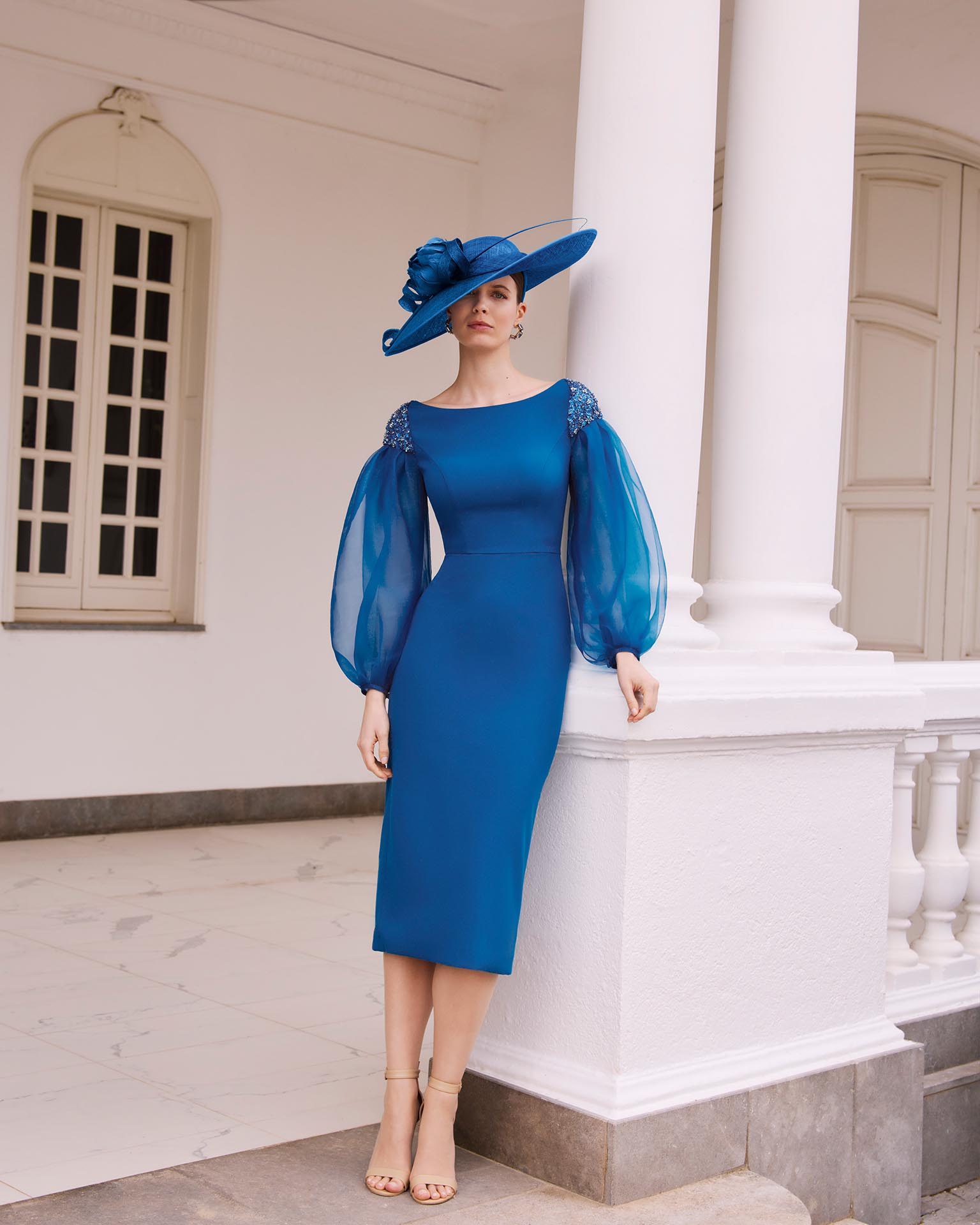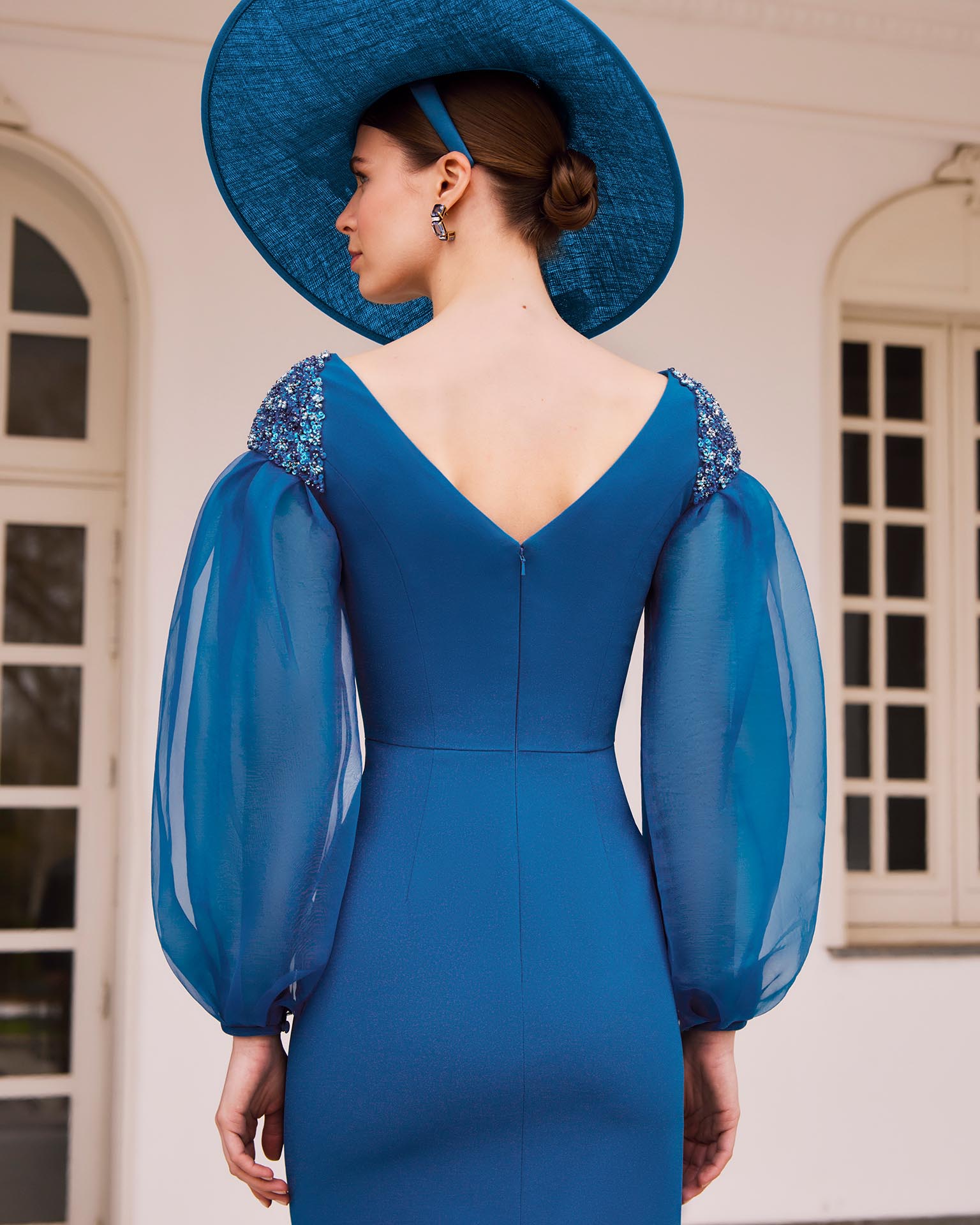 Abito da sera corto in crêpe con perline. Scollo a barca, maniche a sbuffo e schiena a V.