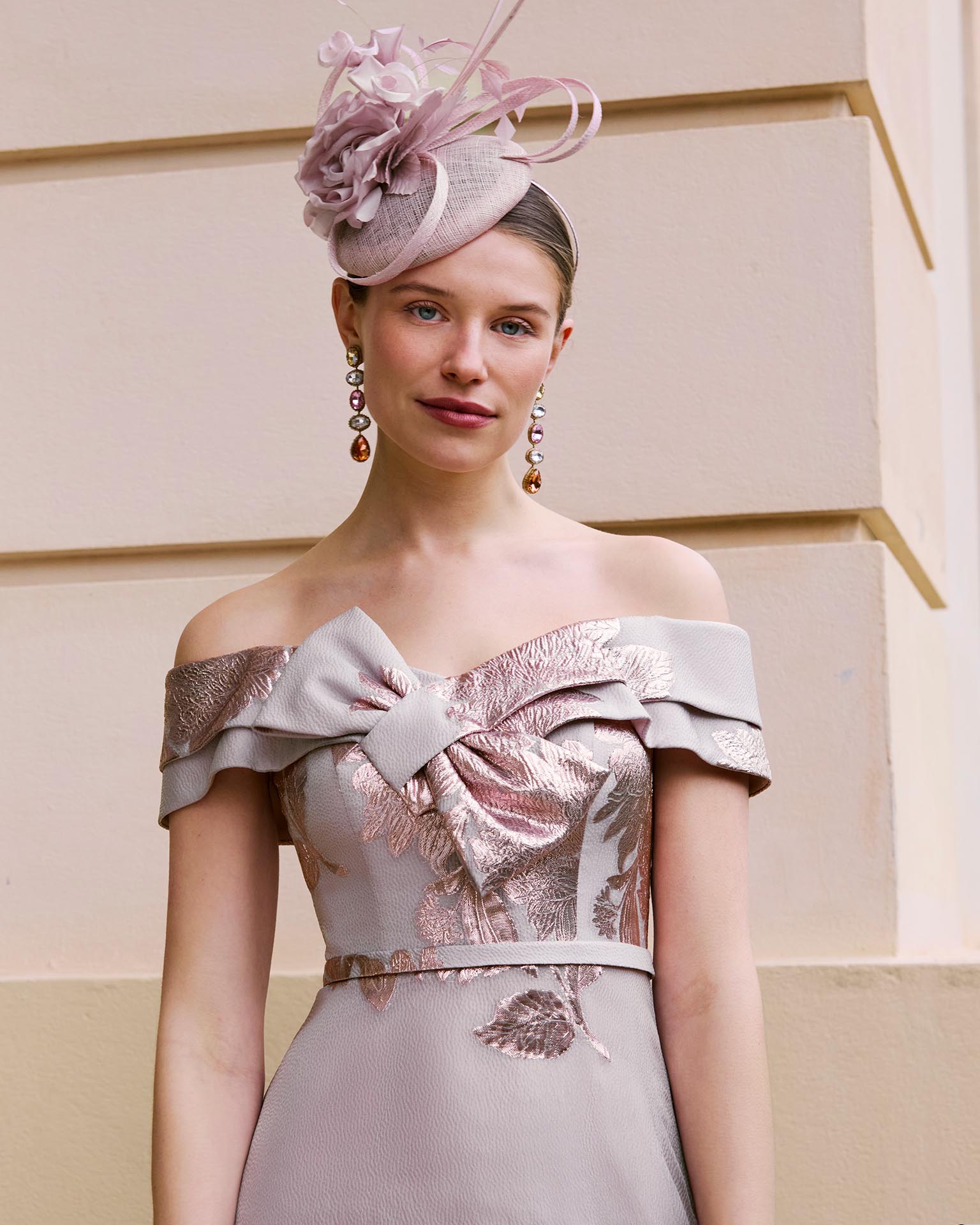Abito da sera midi, in fil coupé. Scollo a barca e scialle.