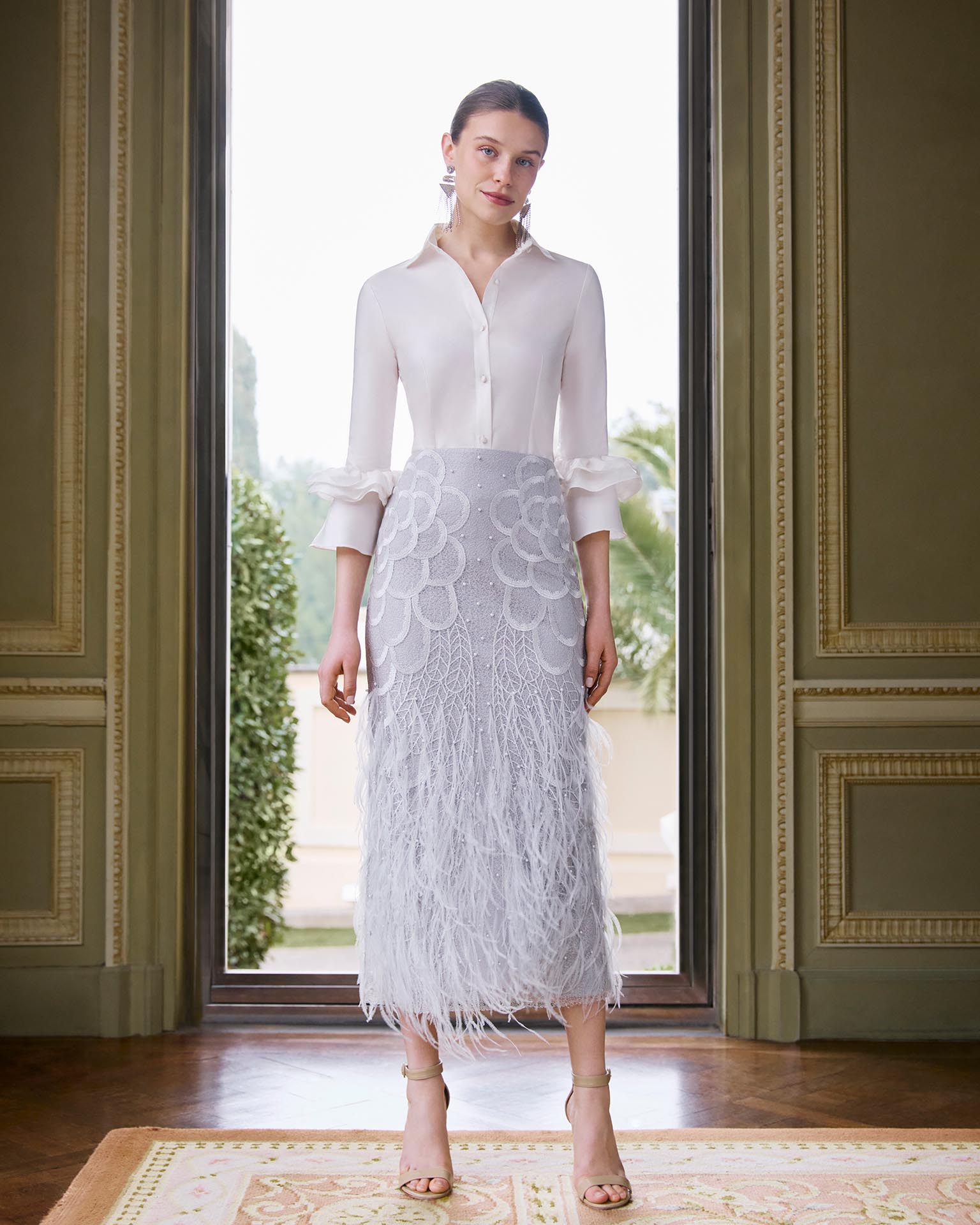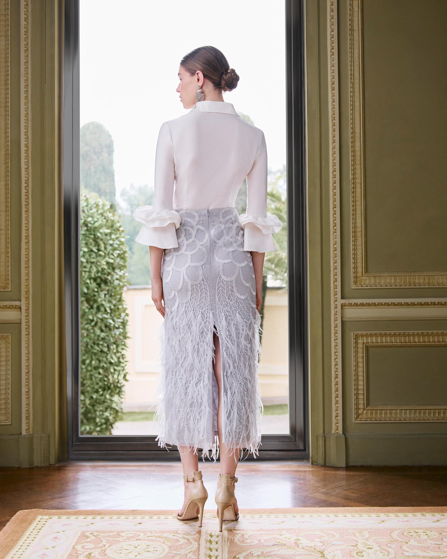 Camicetta e gonna da sera, due pezzi in rete ricamata con blusa in taffetà. Colletto a camicia, maniche a tre quarti, schiena chiusa e piume.