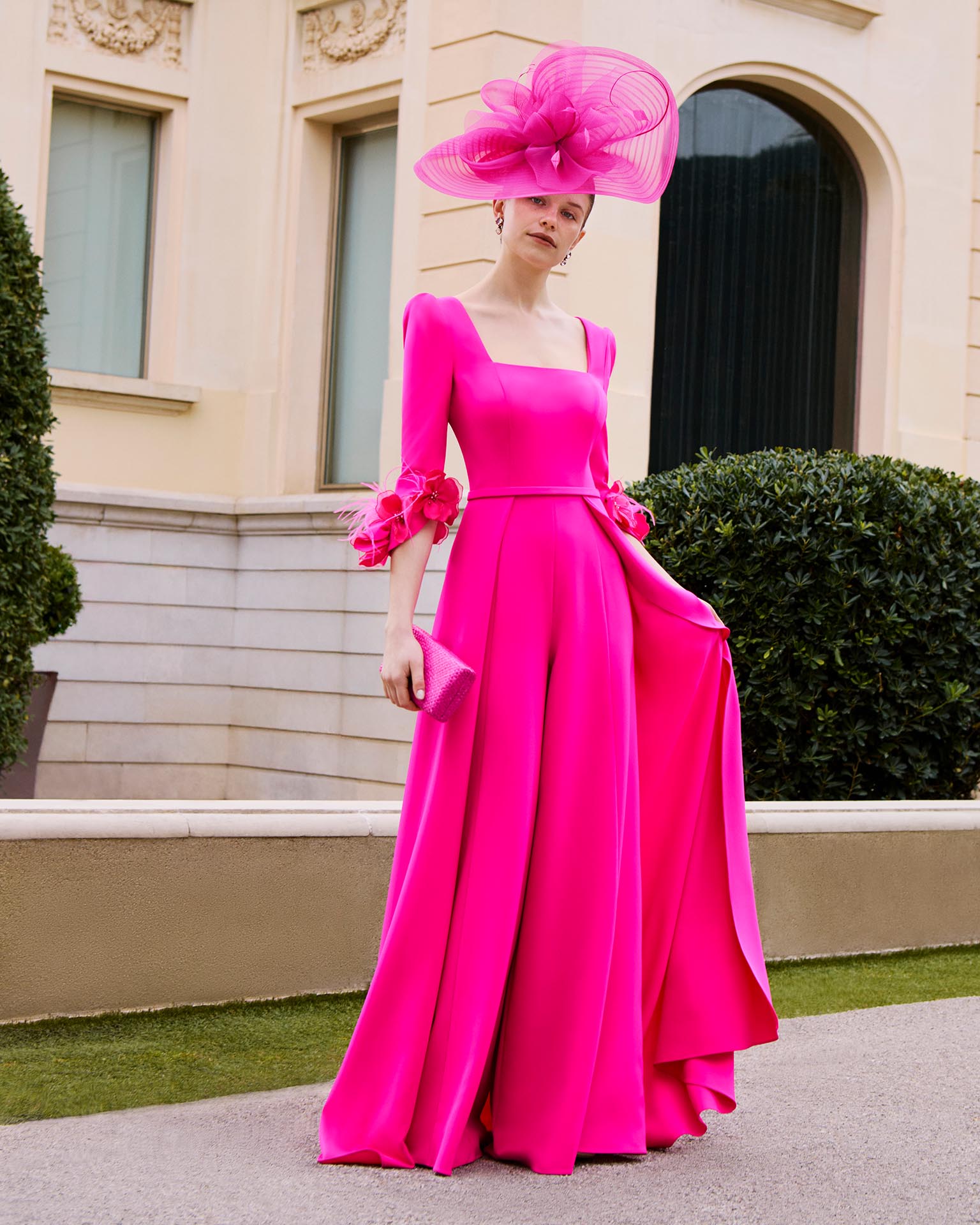 Tuta da sera, in crêpe. Scollo quadrato, maniche a tre quarti e schiena a V.