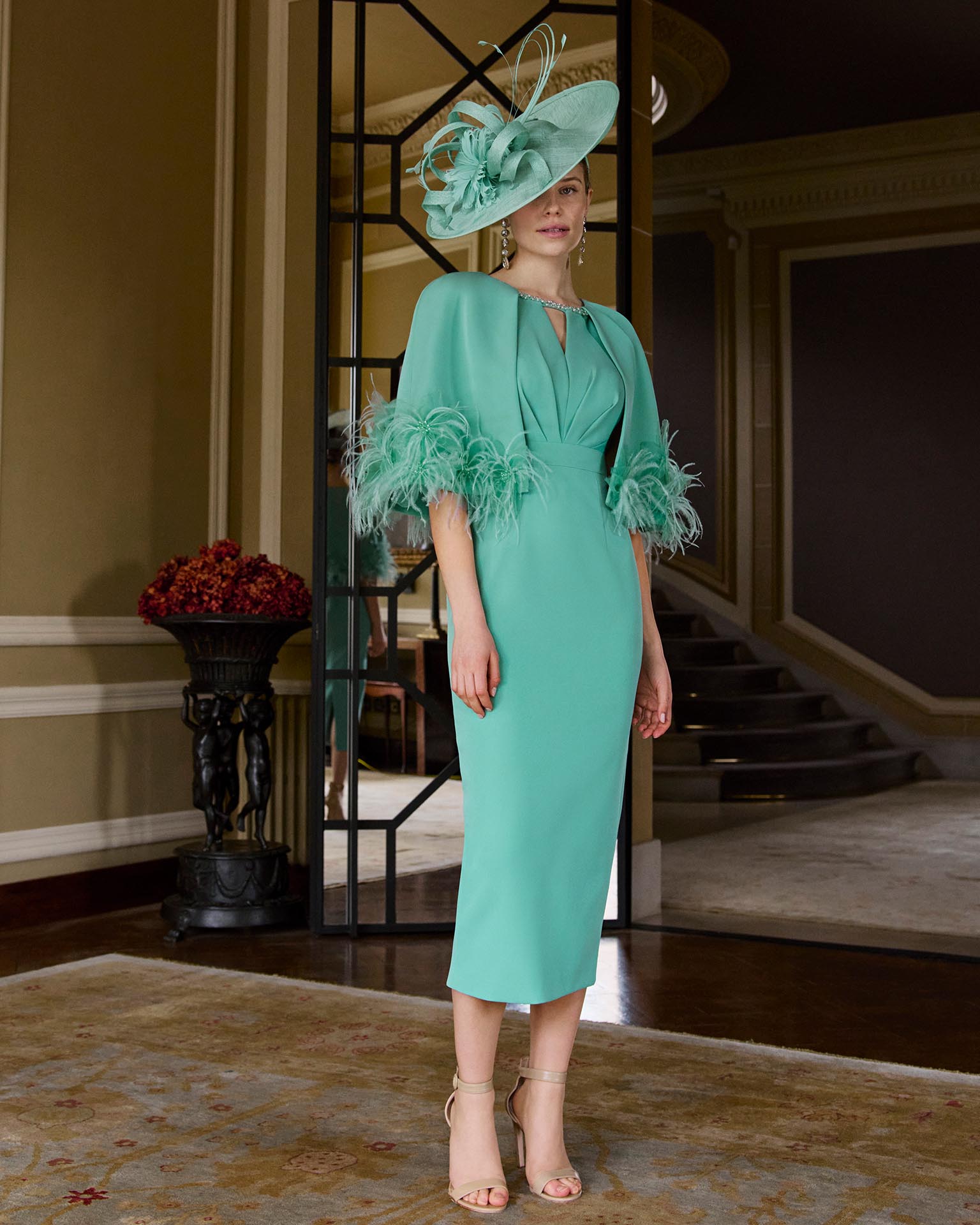 Abito da sera midi, in satin con fiori. Scollo a barca, maniche a mantella, schiena chiusa e piume.