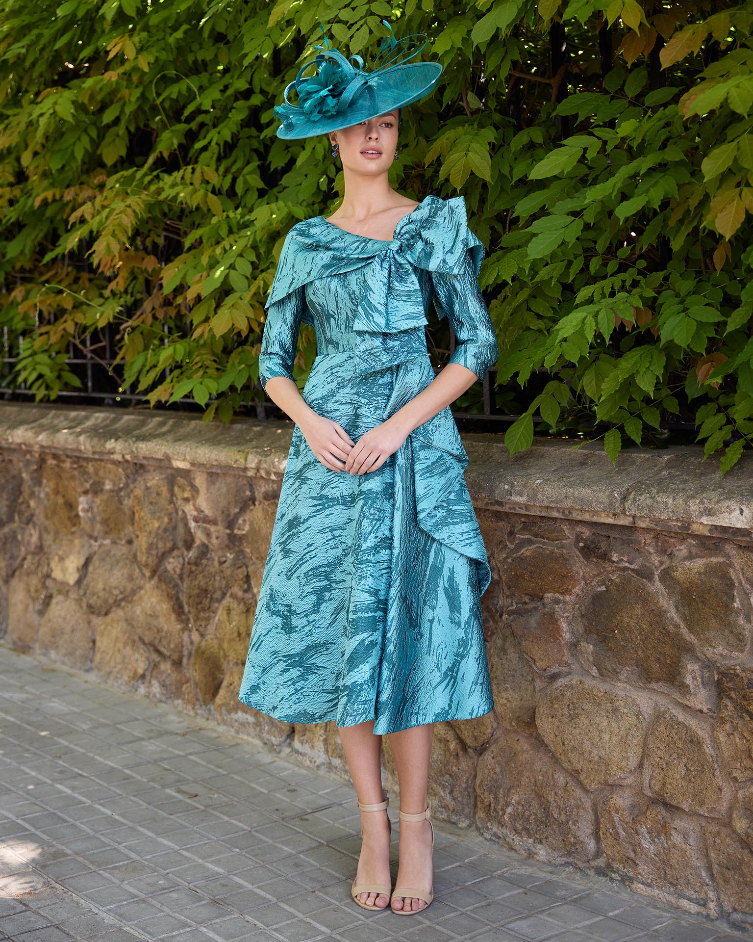 Abito da sera midi, in broccato. Scollo asimmetrico, maniche a tre quarti e schiena chiusa.