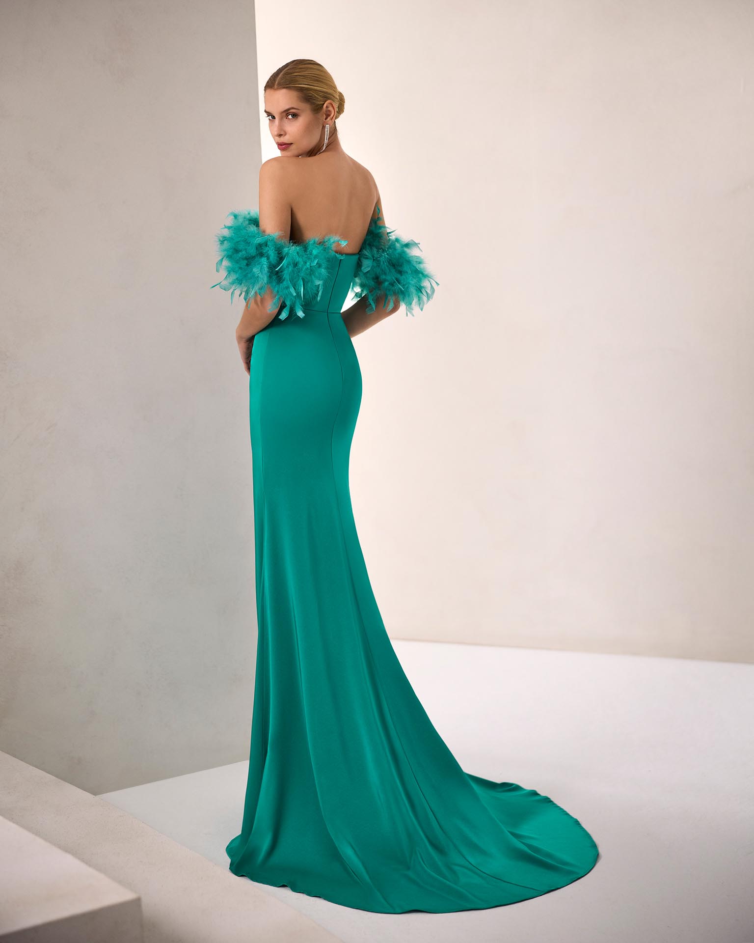 Abito da sera lungo. Realizzato in crêpe satin. Scollo a cuore e spalline cadenti. Dettagli con perline. Include scialle.