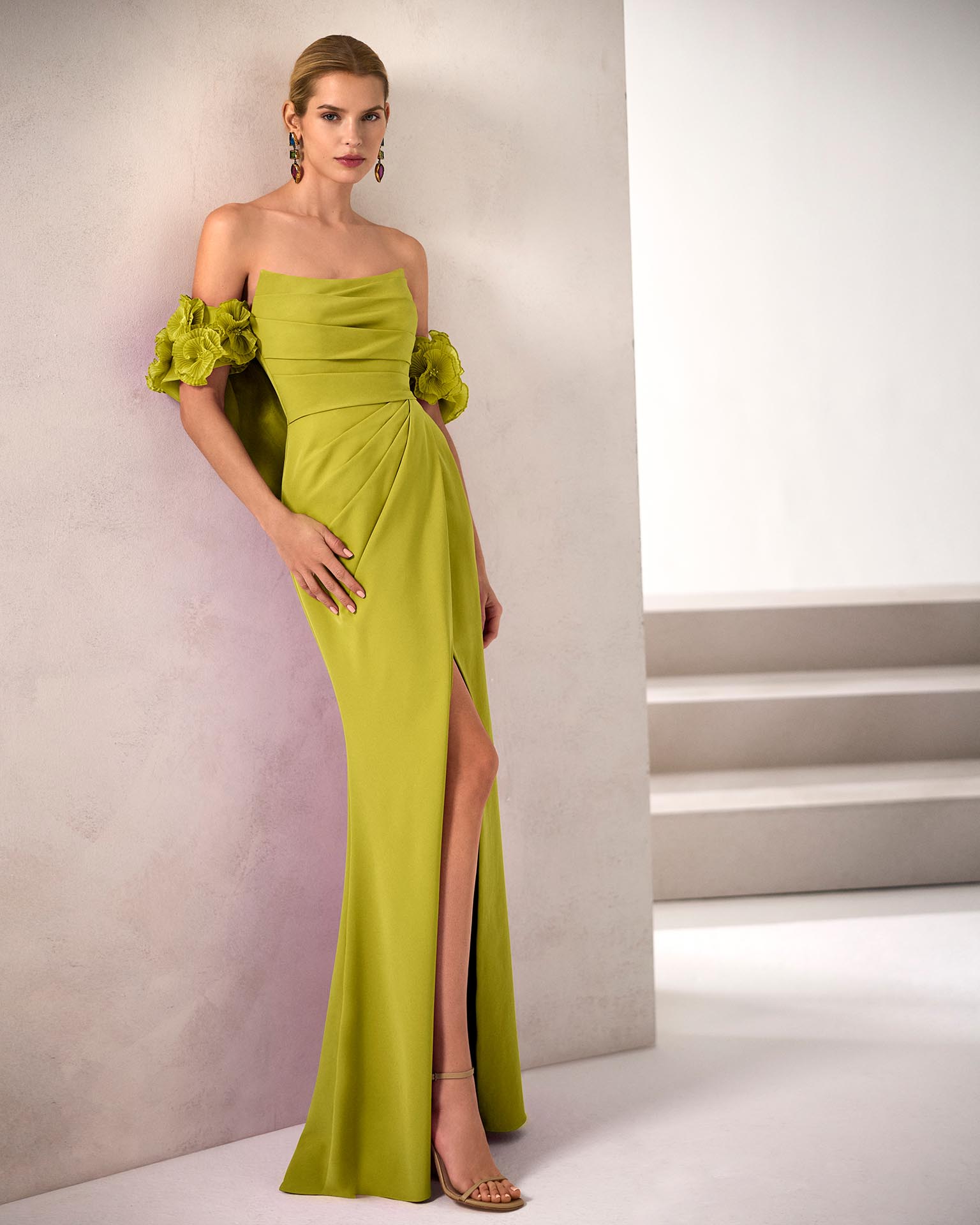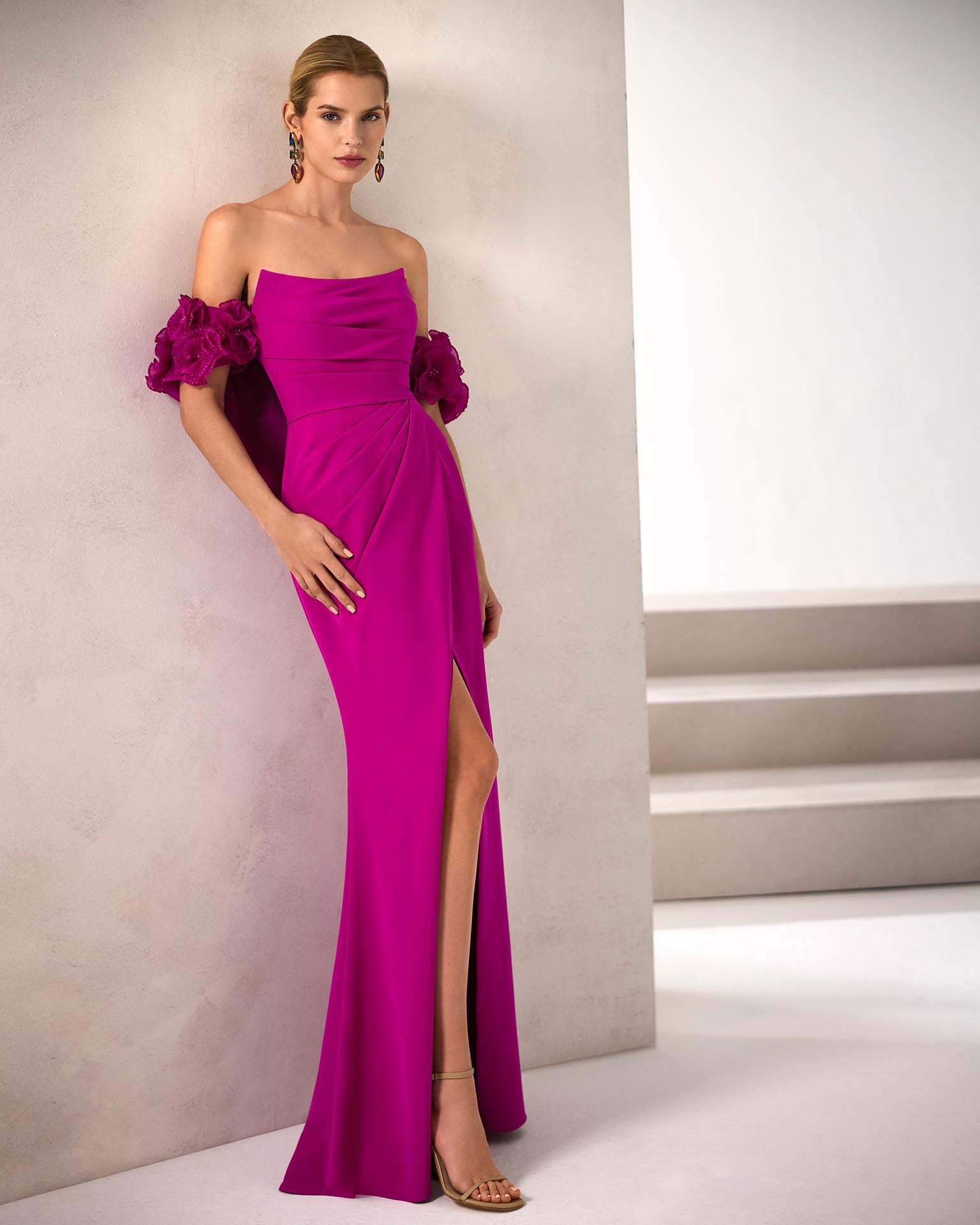 Abito da sera lungo due pezzi. Realizzato in crêpe elasticizzato. Scollo senza spalline. Include giacca.