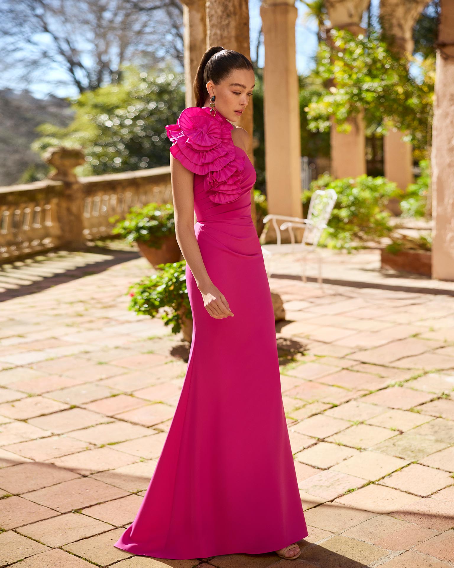 Abito da sera lungo. Realizzato in crêpe elasticizzato. Scollo asimmetrico. Include scialle.