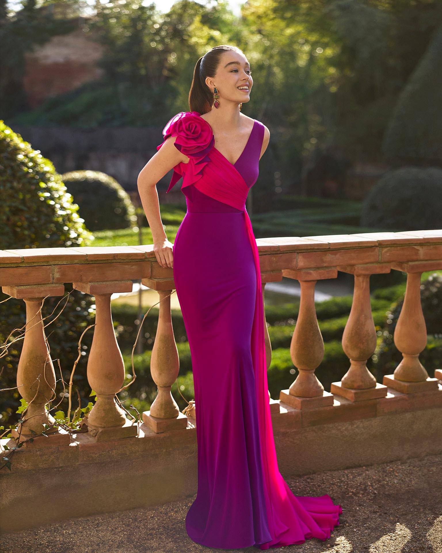 Abito da sera lungo. Realizzato in jersey. Scollo a V e schiena a V. Dettagli floreali. Include scialle.