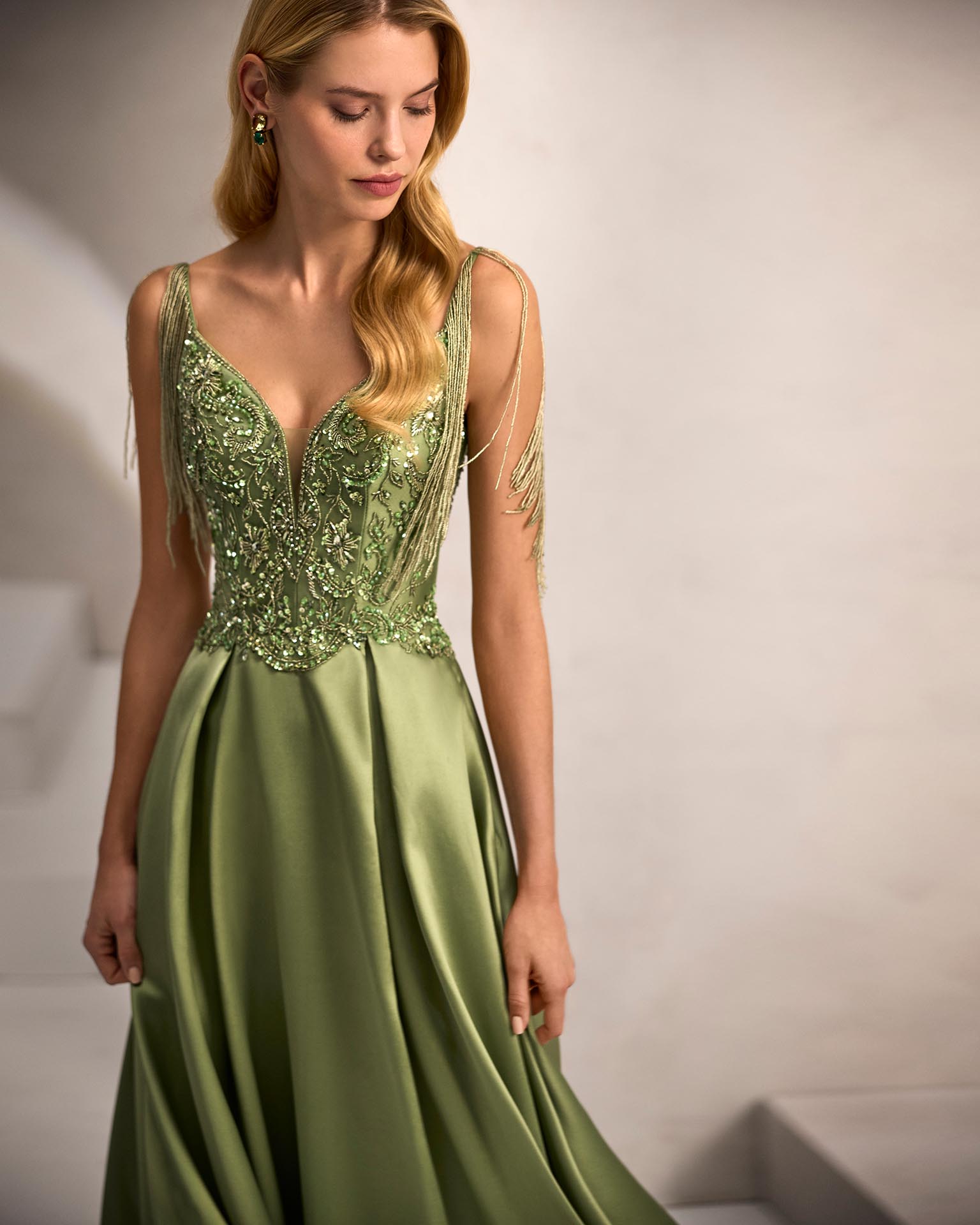 Abito da sera lungo in mikado. Scollo a V, spalline e schiena con cerniera. Corpetto con perline. Include scialle.