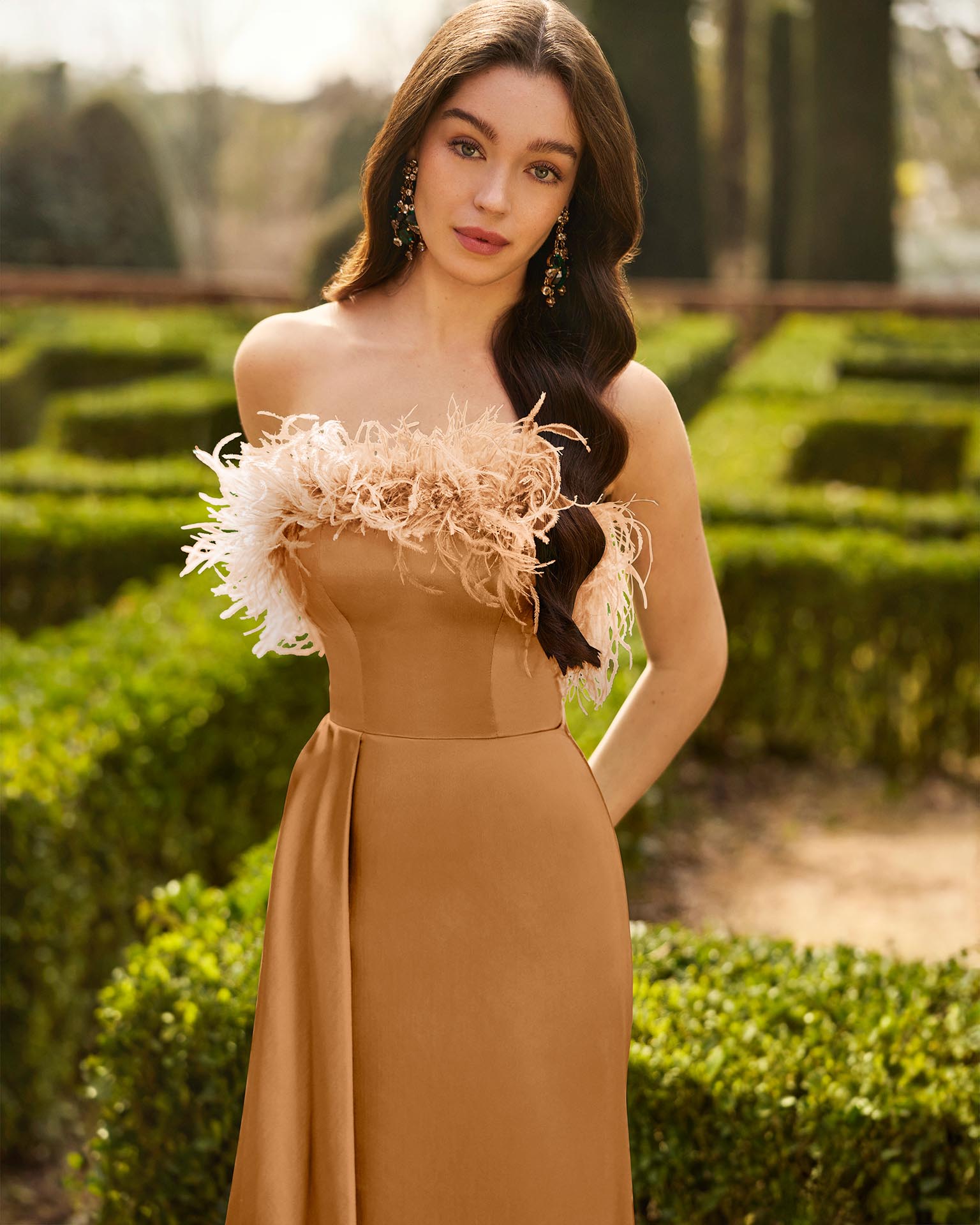 Abito da sera lungo. Realizzato in raso. Scollo senza spalline con piume. Include scialle.