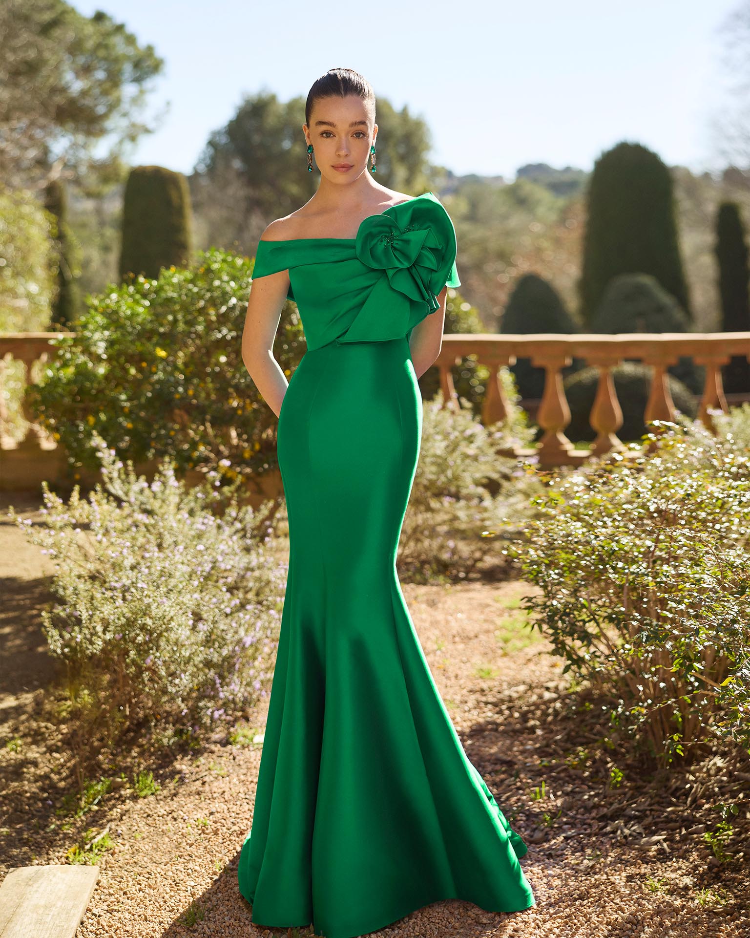 Abito da sera lungo. Realizzato in mikado. Scollo avvolgente e schiena con cerniera. Include scialle.