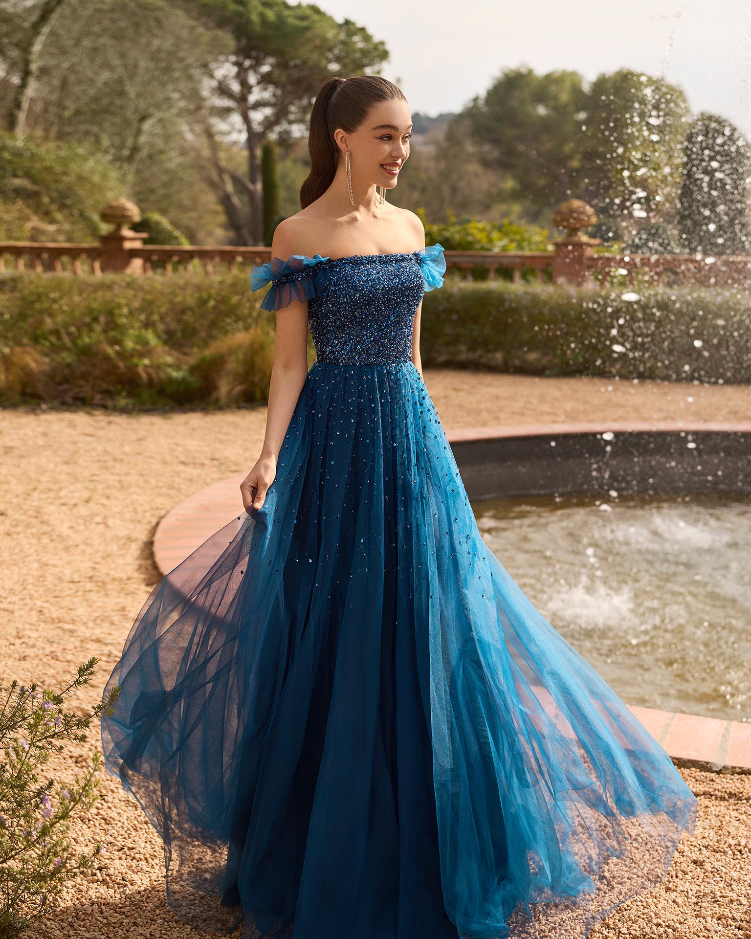 Abito da cocktail lungo, realizzato in tulle e perline, con scollo senza spalline e spalline cadenti, e scialle.