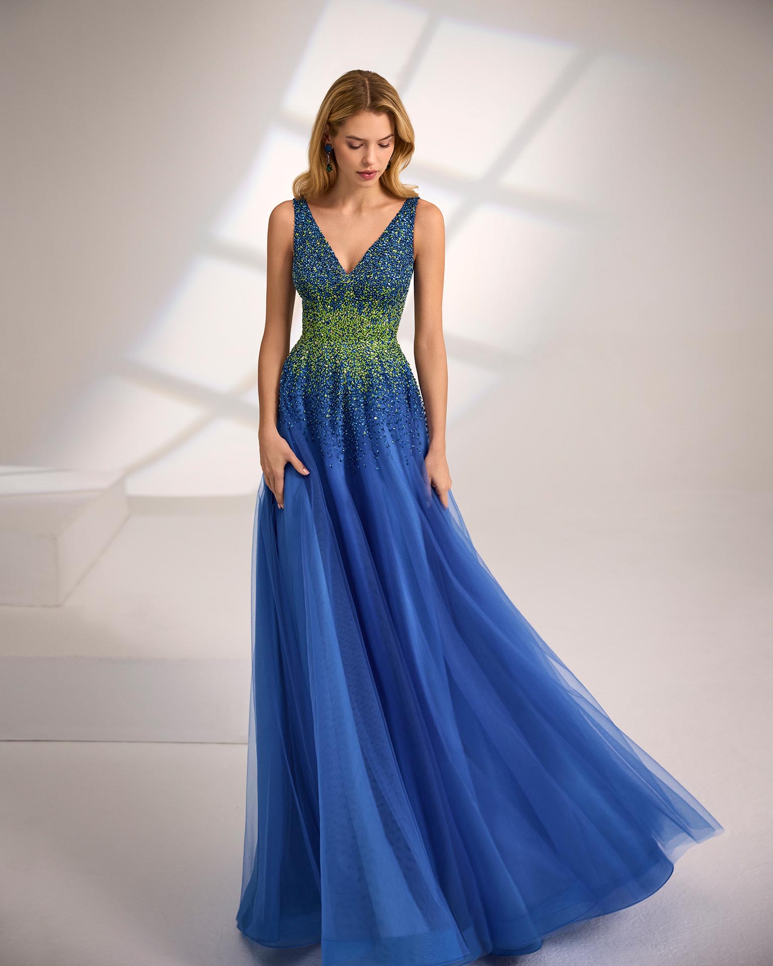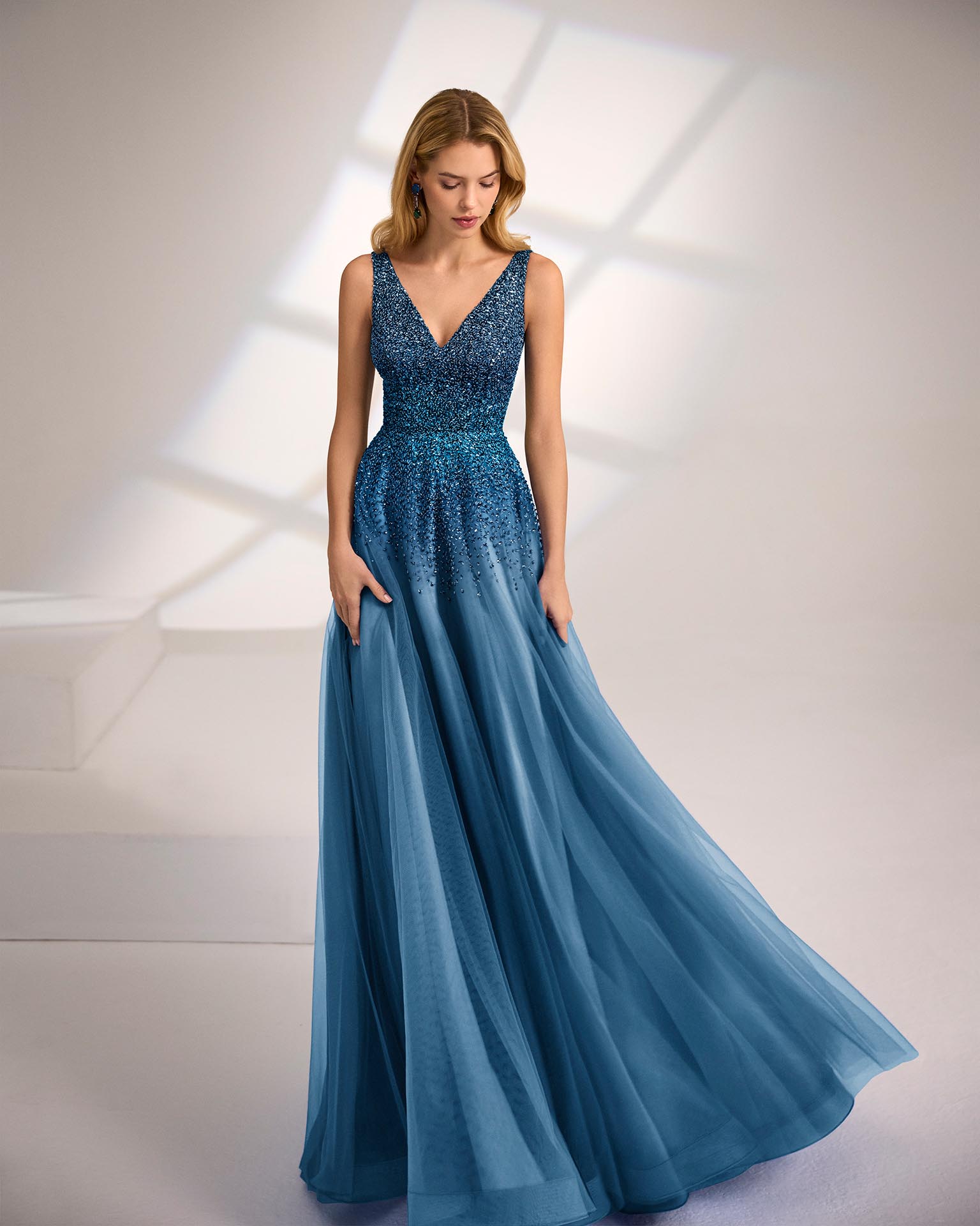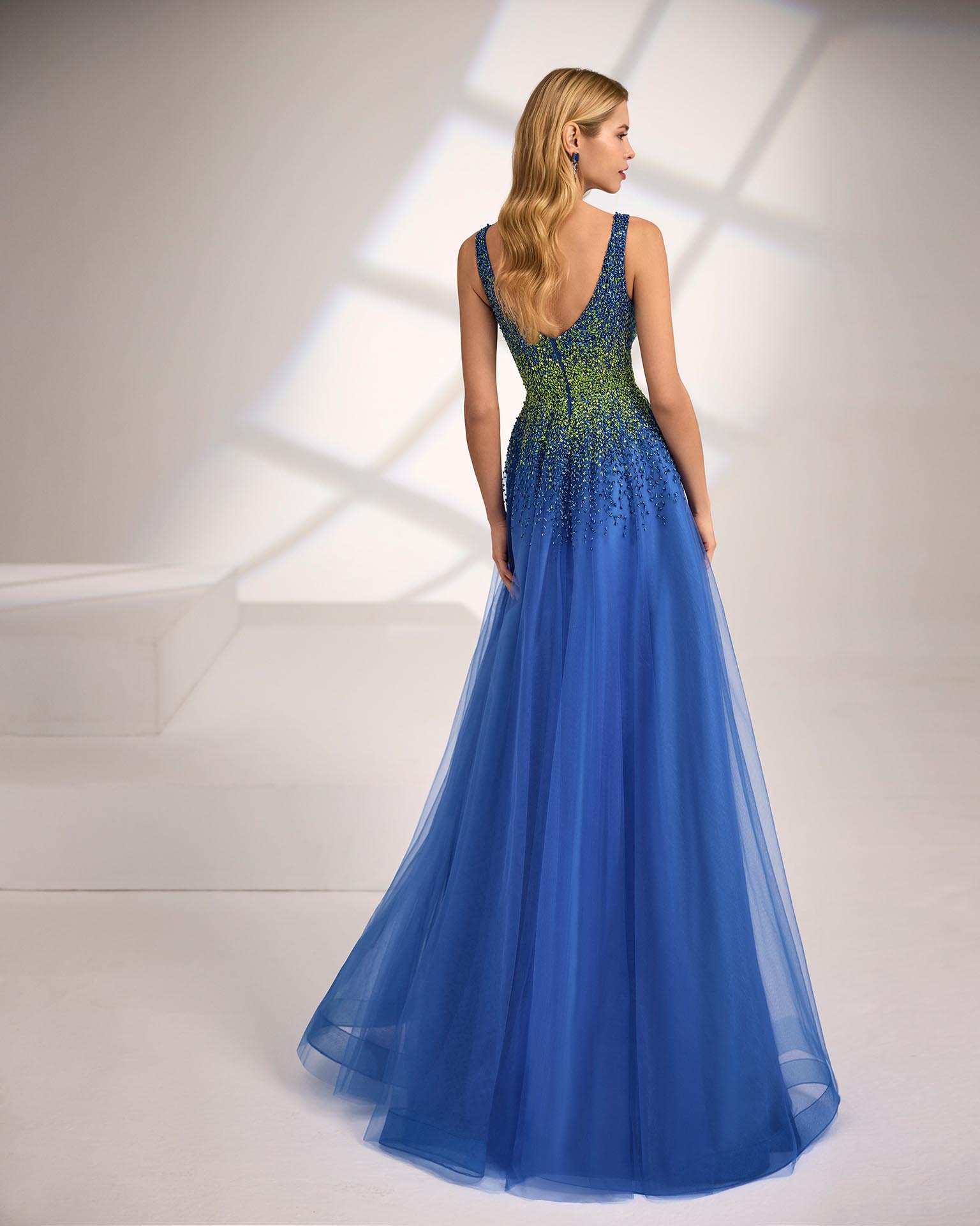Abito da sera lungo. Realizzato in tulle. Scollo a V e schiena a V. Corpino con perline. Include scialle.