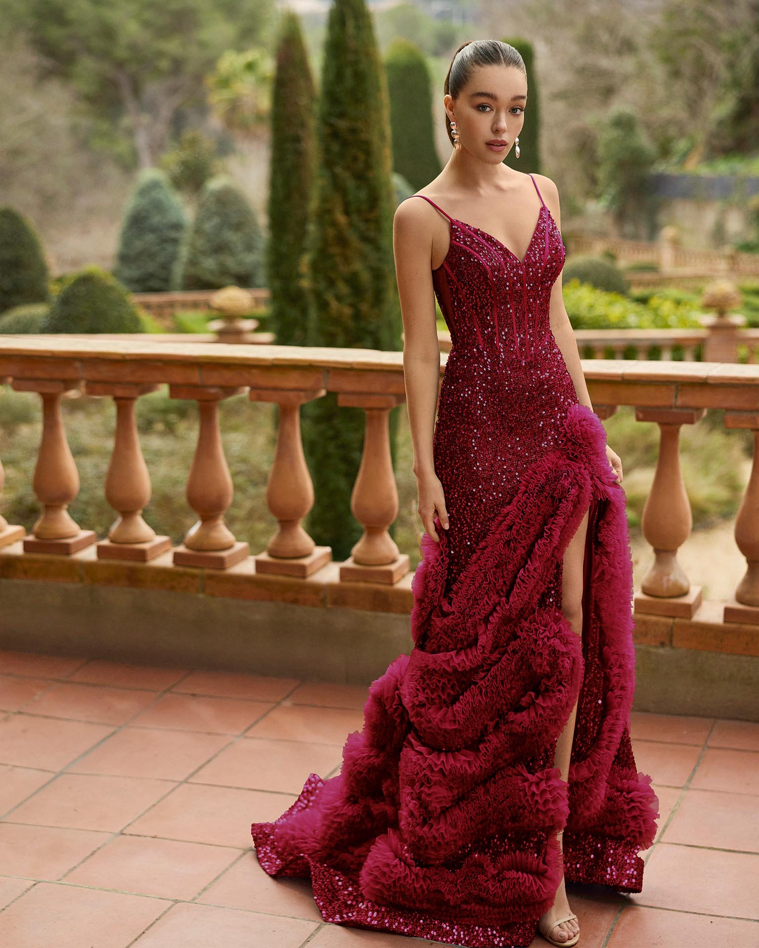 Abito da sera lungo. Realizzato in paillettes. Scollo a V con spalline. Volant in tulle sulla gonna. Include scialle.