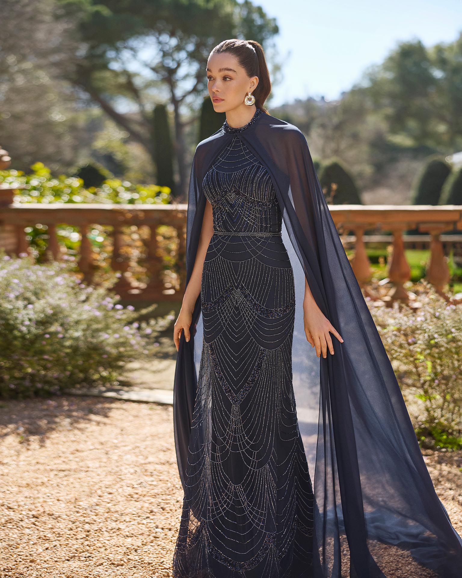 Abito da sera lungo. Realizzato in tessuto perline. Scollo halter e schiena dritta. Include mantello.