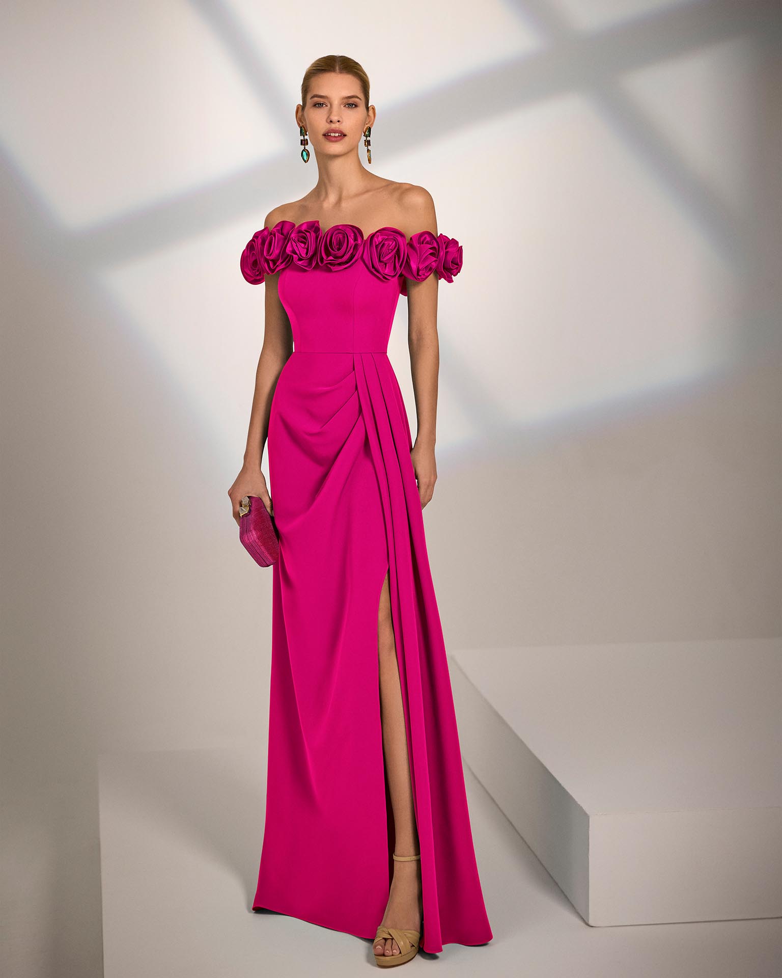 Abito da sera lungo. Realizzato in crêpe elasticizzato. Scollo senza spalline. Dettagli floreali. Include scialle.